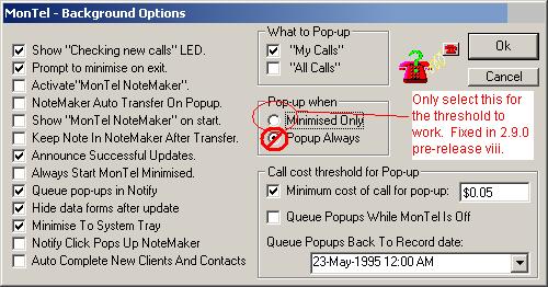 - A bug/coding error in MonTel where if "Pop-up Always" is selected it does what is says in stead of what is meant (which was to pop-up if MonTel for Window toolbar is maximised or normal, as well as minimised).